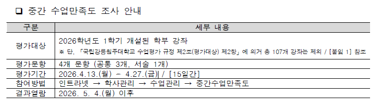 2026학년도 1학기 중간 수업만족도(수업평가) 조사 안내